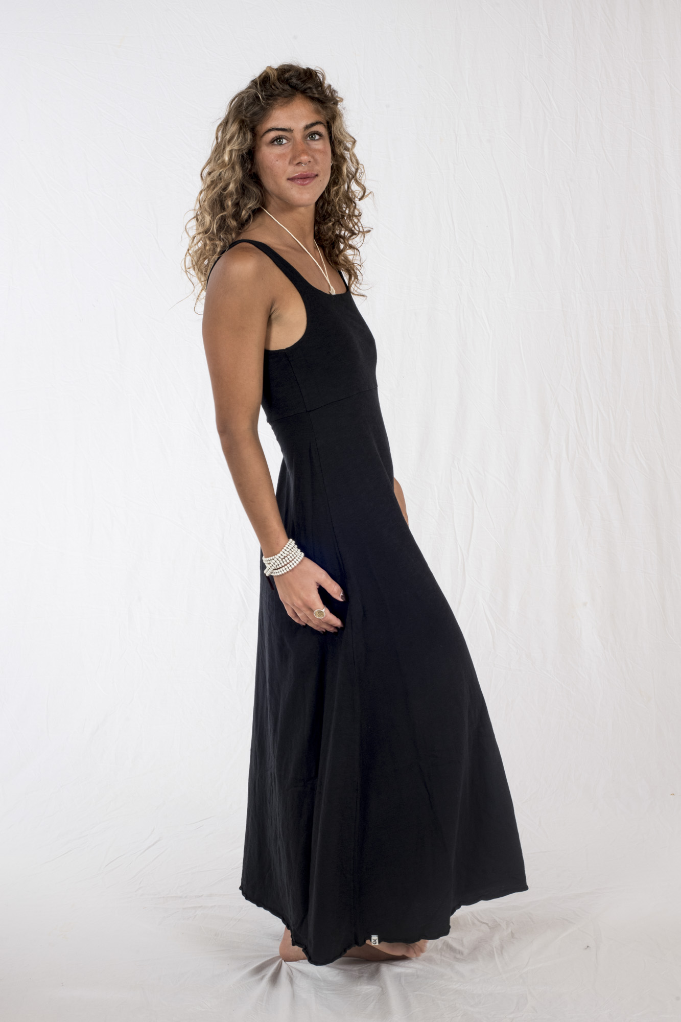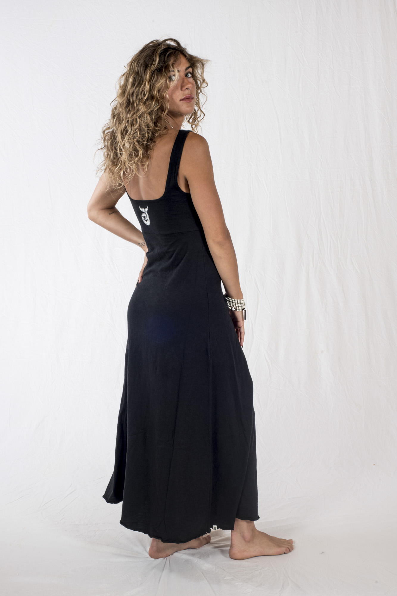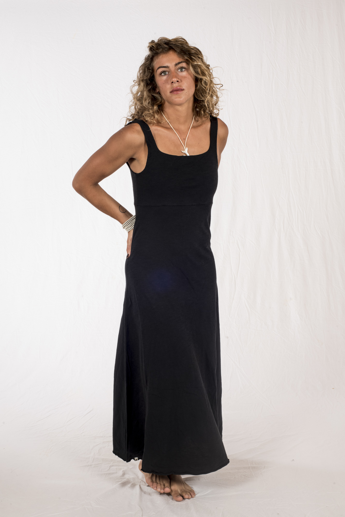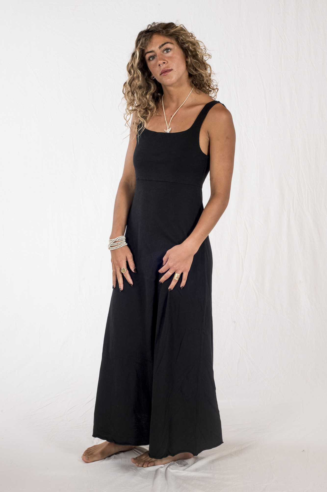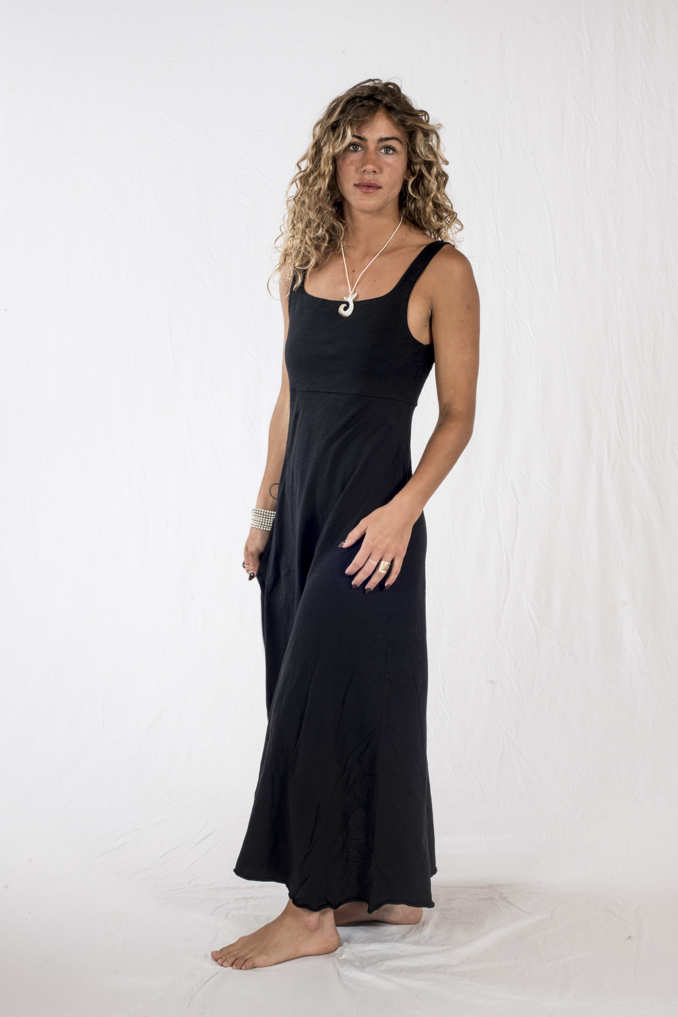 Elegante Vestito, in morbidissimo jersey fiamato, lungo e leggero, scollo quadrato sia davanti che dietro, ottima vestibilità, colore Nero.