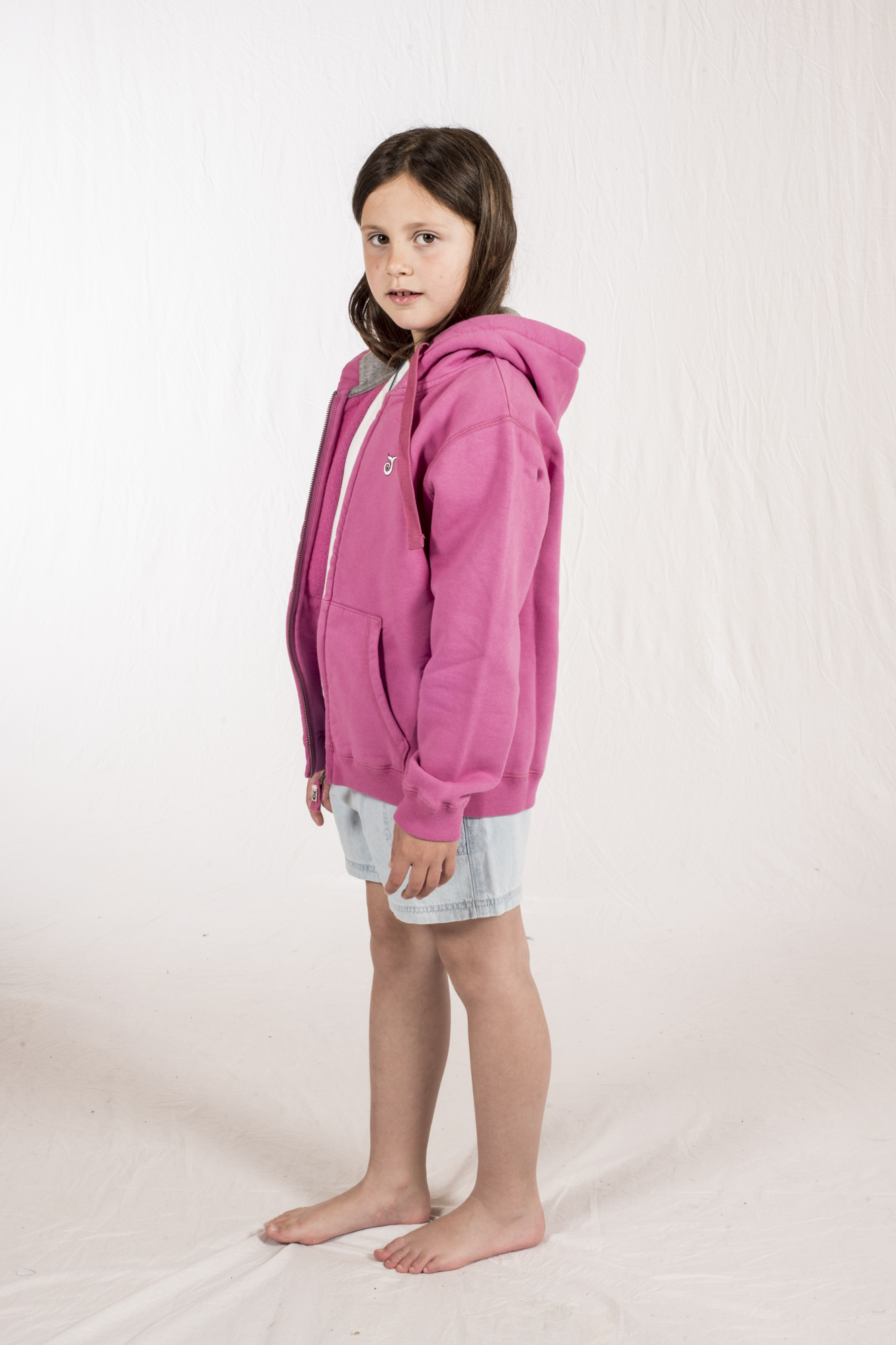 Morbida ed avvolgente felpa con zip e cappuccio, colore Rosa, interno grigio.