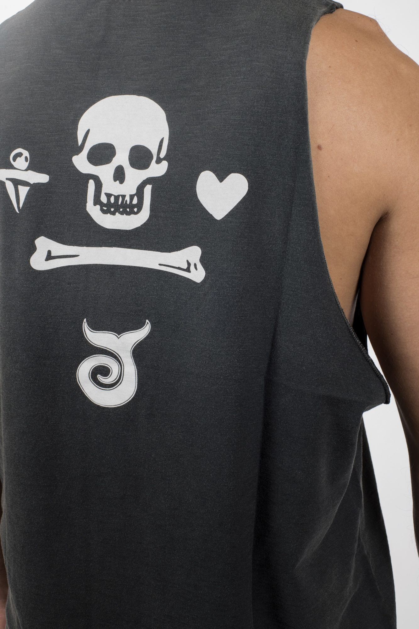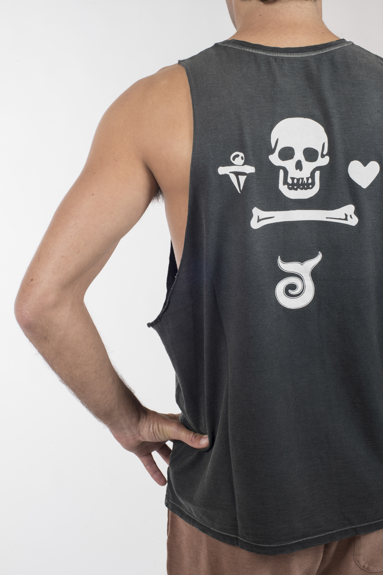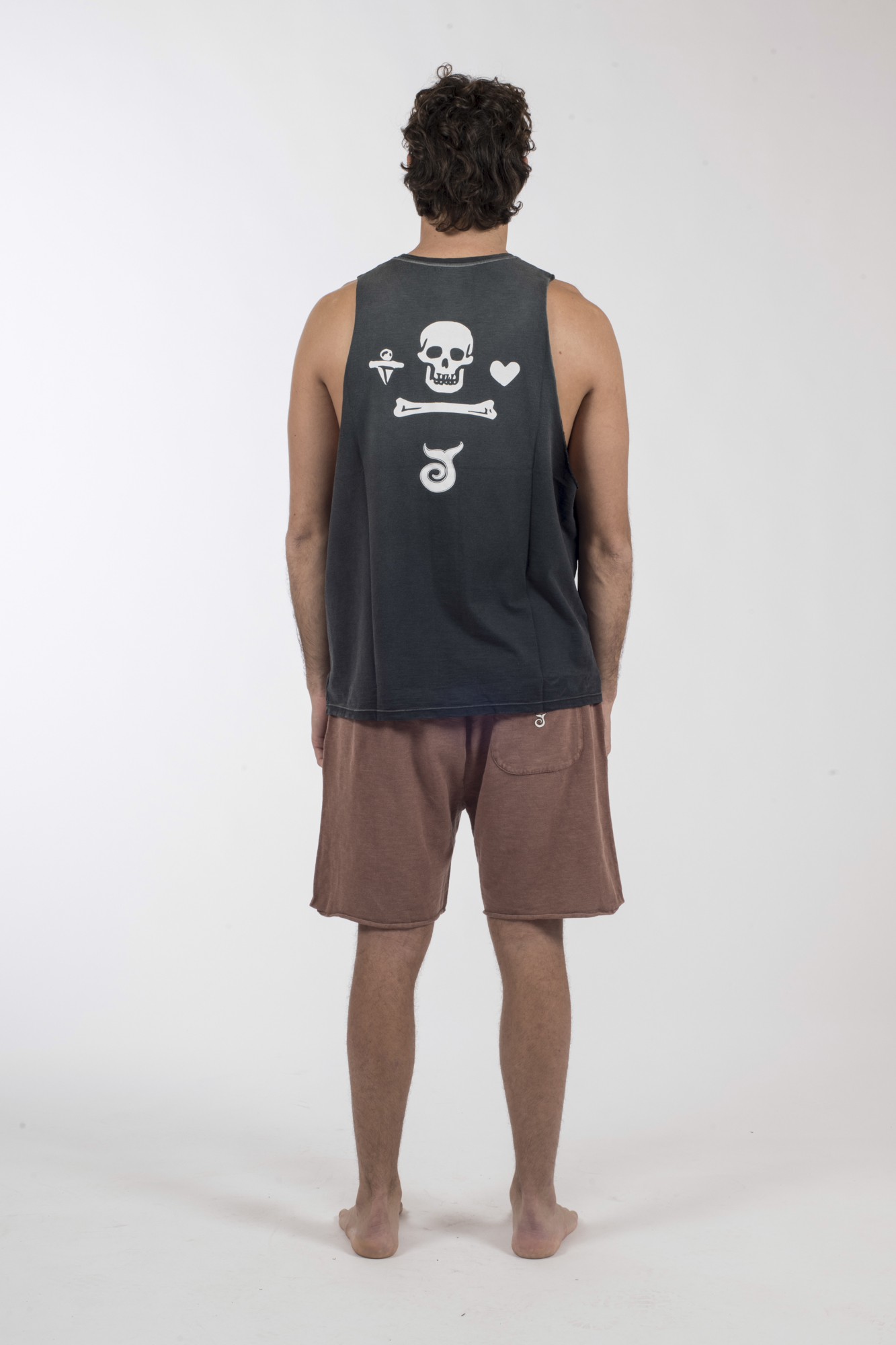 Per uomini pirata, comoda, fresca e leggera. Scollo tondo, taglio vivo fino a metà busto. In jersey fiammato marmorizzato, Logo Pirate White Stede Bonnet sul retro e piccola coda davanti, lato cuore.